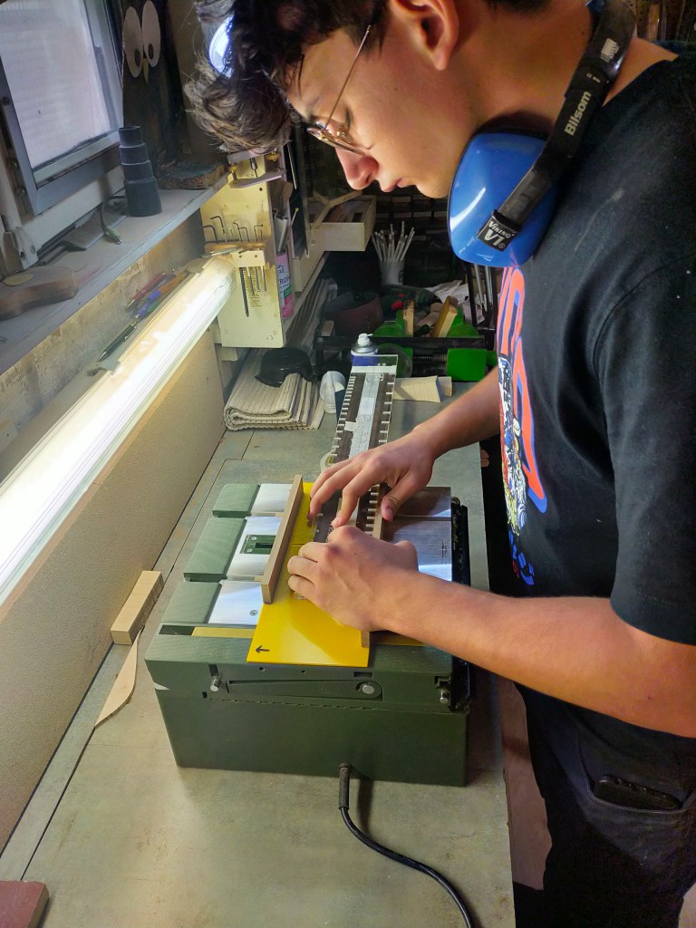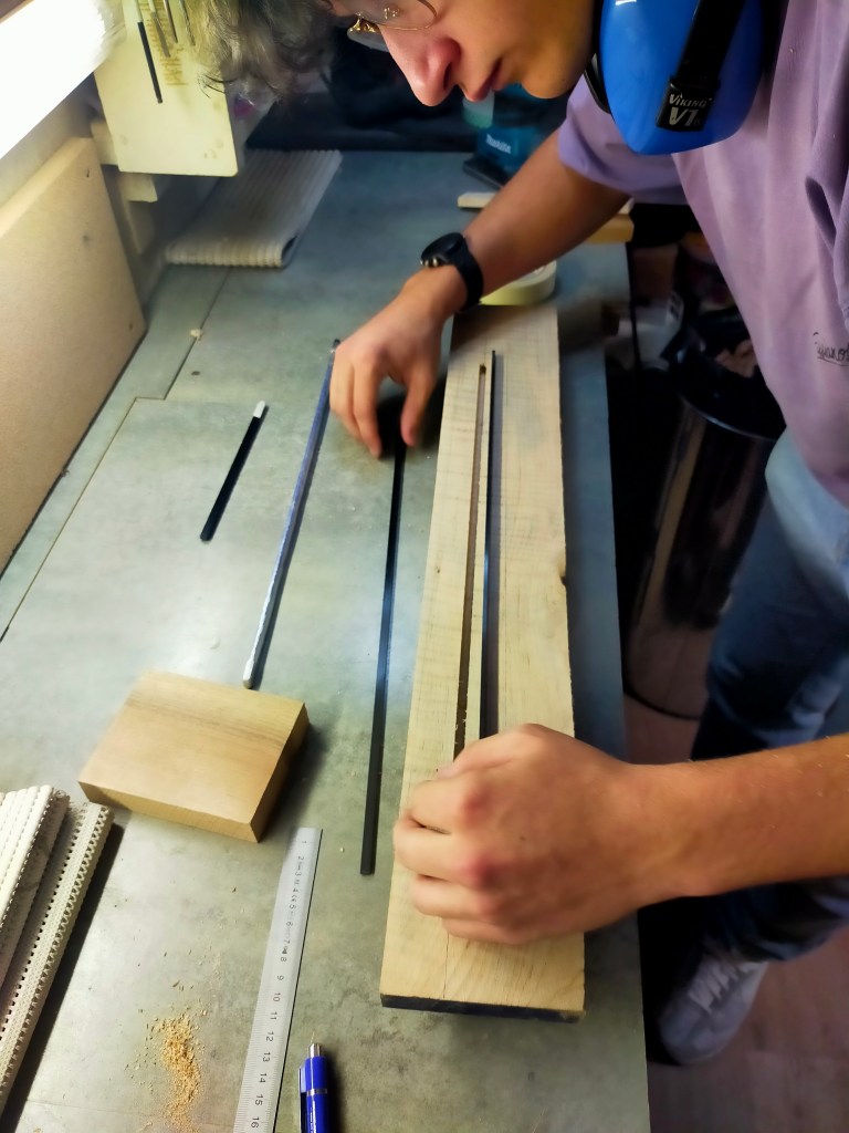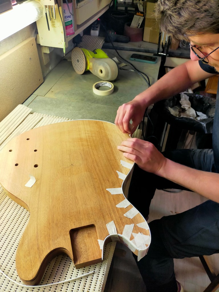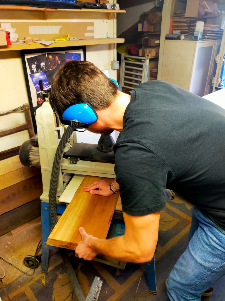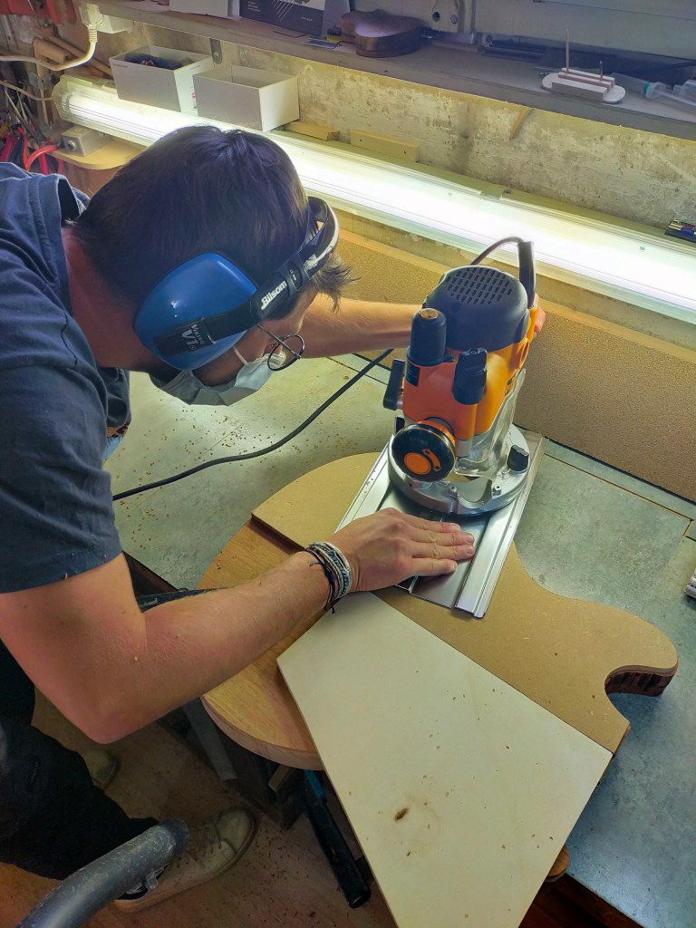 Tom vient se fabriquer une guitare headless en Bubinga, Frêne et Erable.