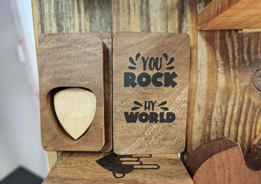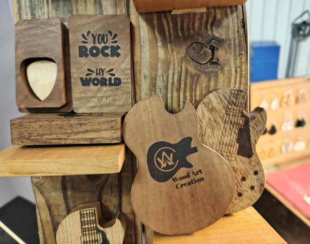 De petits écrins de bois, uniques et raffinés, façonnés à la main pour protéger et sublimer vos médiators.